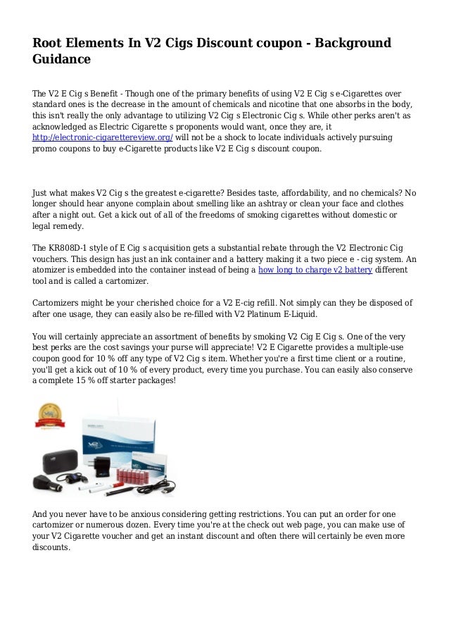 V2 Cigs Coupon Code: 15% Discount - eCig One eCig One is pleased to offer its readers a V2 Cigs coupon good for up to 15% off of your order! Simply click one of the buttons below to reveal the coupon code and open the V2 Cigs website in a new tab. We have long recommended V2 Cigs as an ideal starting point for people new to e-cigarettes.