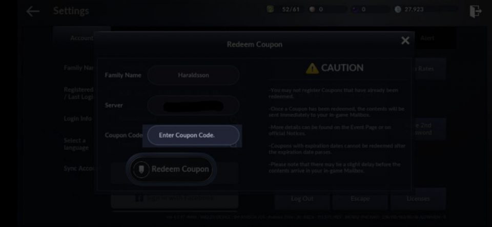 Package | Black Desert Southeast Asia - If you purchase a package on an account that already has access to Black Desert, you will be sent a separate web coupon code for Black Desert game access which can be found on your My Page. - Erethea's Snow Leopard's pet type is RARE and cannot be registered on the Central Market. - Certain parts of the Oblivion Outfit cannot be dyed. Black Desert Mobile Free Coupon Codes and how to redeem ... - GamingonPhone Black Desert Mobile redemption center Tap on the 3 bars on the top right corner of the screen. Select Settings at the bottom left corner on the screen. Tap on the Redeem Coupon button. Enter the redeem code in the Coupon Code box (case sensitive) and tap on Redeem Coupon. Go back to the main screen and tap on the 3 bars again.