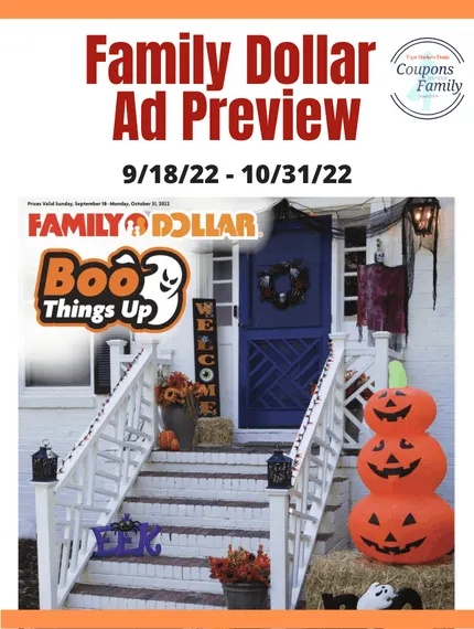 Family Dollar Weekly Ad (9/18/22 - 9/24/22) Preview Check out the new Family Dollar ad to plan your shopping trip ahead of time and get your coupons ready for next week! Get The Early Family Dollar Ad Sent To Your Email (CLICK HERE!) View the Family Dollar locations and hours. 2 FamilyDollar Ads available. Click the links below. FamilyDollar Ad 08/15/22 - 09/17/22 FamilyDollar Ad 09/06/22 - 09/10/22