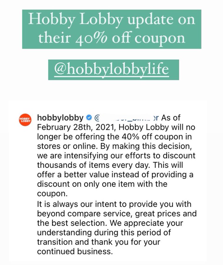 Say Goodbye to Hobby Lobby's 40% Off Coupon The 40% off coupon will be discontinued Feb. 28. Hobby Lobby broke the news to employees across the country in recent days, letting them know that the 40% off coupon customers find in the weekly ad and app will be no more as of the end of February. That said, there's a two-week grace period, so you really have until March 14 to use your coupons. Hobby Lobby Coupon, Promo Codes: 40% Off - October 2022 Hobby Lobby Coupon, Promo Codes: 40% Off - October 2022 Hobby Lobby Coupons Submit a Coupon Delivery 40% OFF Code 40% Off Any 1 Item Added by kdenee78 883 uses today Show Coupon Code See Details 1% BACK Online Cash Back 1% Cash Back For Online Purchases Sitewide Verified 3 uses today Get Reward See Details UP TO 50% OFF Sale